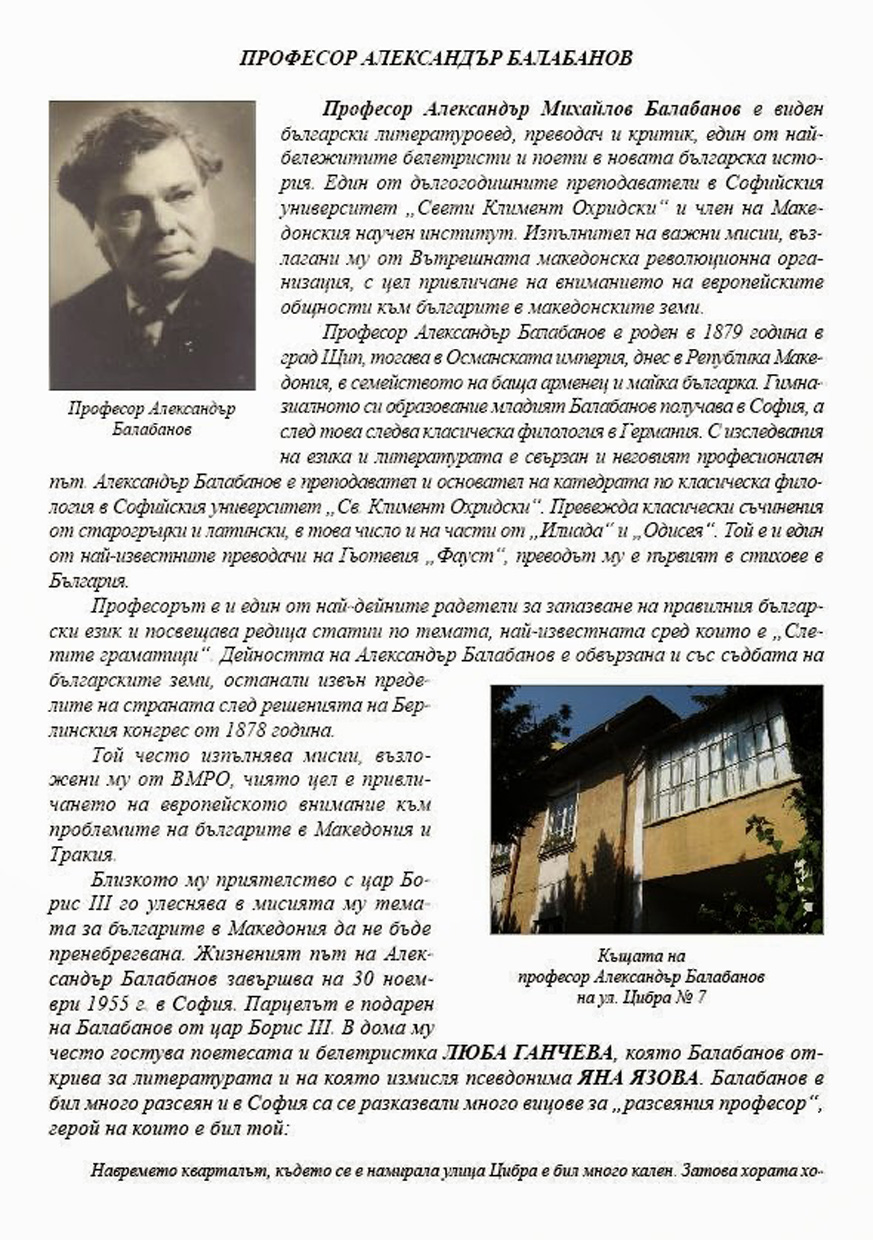 Лука, малко повече подробности за къщата на # 11. Тя е собственост на историка Иван Попов. Парцелът, подарен от цар Борис III, е разделен между него и колегата му Рафаил Попов. Заедно със съседния парцел, на който се намира къщата на проф. Ал.Балабанов, това са двата най-големи парцела от страната на нечетните номера. Иван Попов е син на Стоян Попов - деен участник в подготовката на Априлското въстание и представител на град Пещера на Оборищенското събрание. Бил е дългогодишен учител по история в I-ва мъжка гимназия и автор на многобройни научни трудове. Преподава и на царските деца в Двореца. Жена му Евгения Попова, по баща Бояджиева, е сестра на поета Димитър Бояджиев. Нейни братя са и Коста Бояджиев - директор на Народна Банка и министър на народното стопанство през 1934-1935 година, както и Илия Бояджиев - дипломат в Лондон и Мадрид и посланик в Португалия. Синът на Иван Попов - Стоян Кайнаров, е бил шарже д'афер в българската легация в Стокхолм. Известен преводач, член учредител на Съюза на българските преводачи.